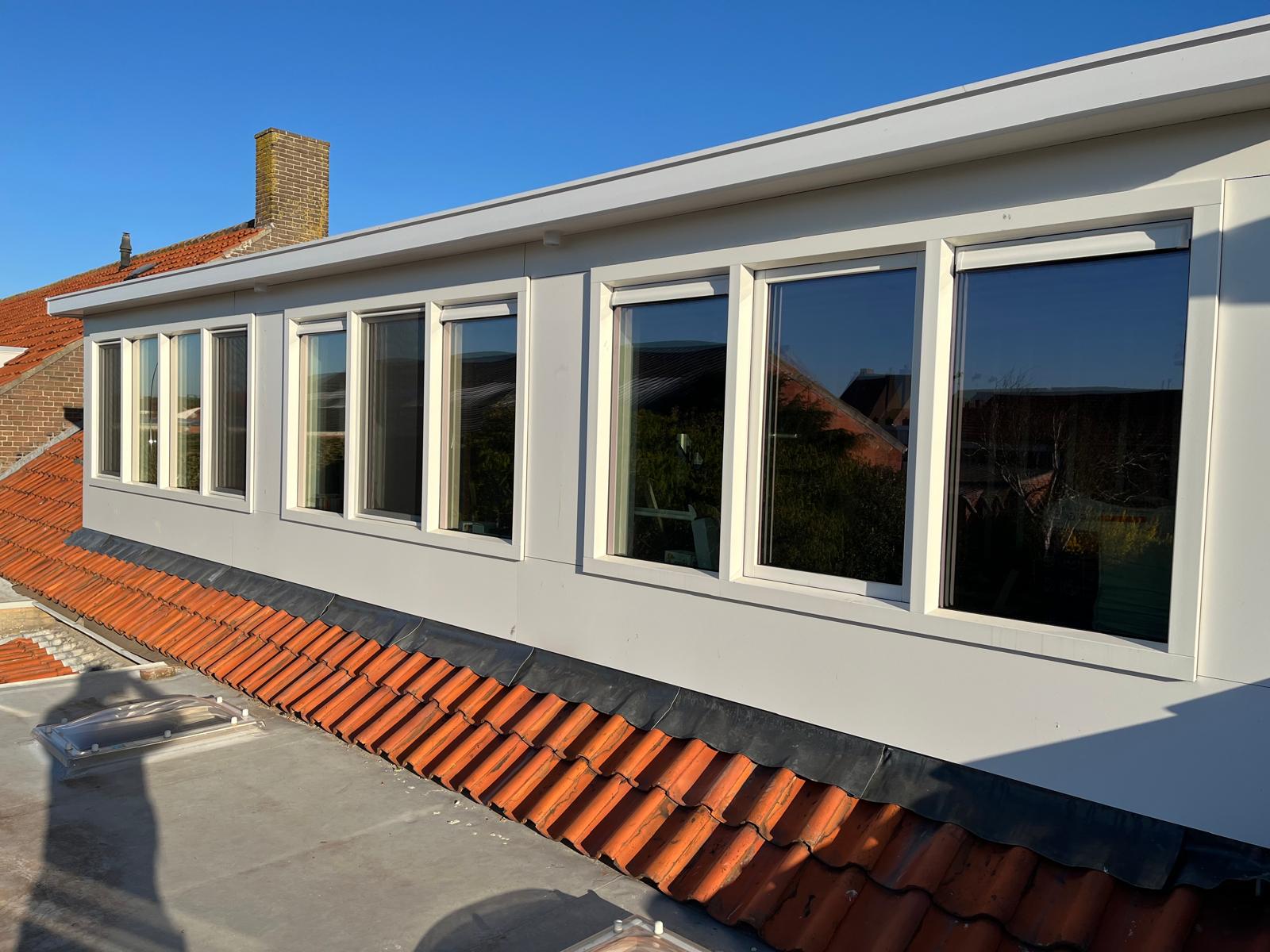 In het werk getimmerde dakkapel voorzien van kunststof kozijnen en onderhoud arm materiaal.